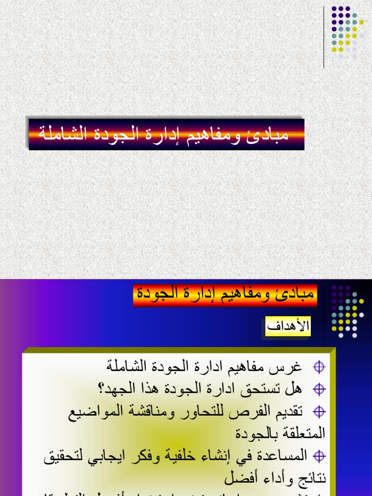 88 17 88 found this document useful 17 votes 5k views 68 pages. إدارة الجودة تتضمن مفاهيم مثل الجودة الشاملة وضمان الجودة هذه النوعية قالب إدارة ppt هو الخيار الأمثل إذا كنت تبحث عن قالب جودة باور بوينت مجانا لتقديم العروض الخاصة بك. المتدربين بالمهارات والأدوات الضرورية اللازمة لتطبيق مفهوم إدارة الجودة الشاملة. إدارة الجودة الشاملة الإدارة التقليدية الرقابة ذاتية الرقابة اللصيقة وتصيد الأخطاء العمل الجماعي وروح الفريق العمل الفردي التركيز على المنتج والعمليات التركيز على المنتج التحسين المستمر التحسين وقت الحاجة اندماج.