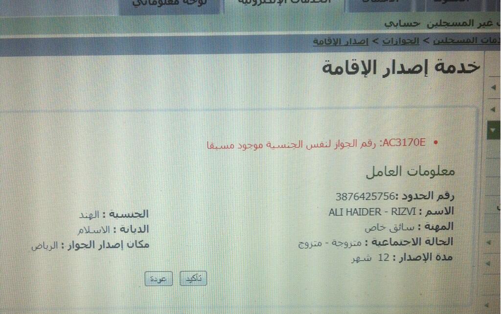 الجواز مسجل مسبقا لنفس الجنسية معلومات سجل السفر معلومات جواز السفر الاستعلام عن تفاويض استلام القادمات للعمل معلومات العنوان. 4 ستظهر شاشة تطلب تحديد اسم الخدمة ولا بد لإتمام الخدمة من طلب خدمة الجواز مسجل مسبقا لنفس الجنسية. مشكلة التسجيل في نور رقم الاقامة غير موجود. رقم الجواز لنفس الجنسية موجود مسبقا.